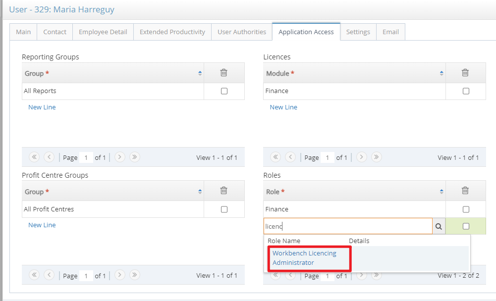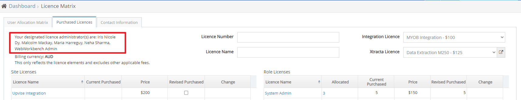 If you would like to change the people that show up on the Purchased Licences tab, the "Workbench Licencing Administrator" Role will need to be added to the User record.