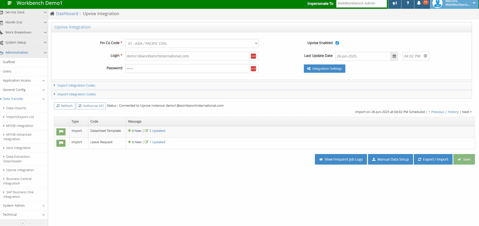 5. Timesheet Import Disabled for FinCo Administration - Data transfer - Upvsie Integration | ![]() |